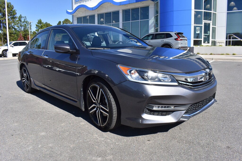 CARFAX One-Owner. Certified. Modern Steel Metallic 2017 Honda Accord Sport FWD CVT 2.4L I4 DOHC i-VTEC 16V 19" Alloy Wheels, 4 Speakers, 4-Wheel Disc Brakes, ABS brakes, Air Conditioning, Alloy wheels, AM/FM radio, Automatic temperature control, Brake assist, Bumpers: body-color, CD player, Cloth Seat Trim, Delay-off headlights, Dual front impact airbags, Dual front side impact airbags, Electronic Stability Control, Exterior Parking Camera Rear, Four wheel independent suspension, Front anti-roll bar, Front Center Armrest, Front dual zone A/C, Front fog lights, Fully automatic headlights, Illuminated entry, Leather Shift Knob, Low tire pressure warning, Occupant sensing airbag, Outside temperature display, Overhead airbag, Panic alarm, Power door mirrors, Power driver seat, Power steering, Power windows, Radio data system, Radio: 160-Watt AM/FM Audio System, Rear anti-roll bar, Rear window defroster, Remote keyless entry, Security system, Speed control, Speed-sensing steering, Speed-Sensitive Wipers, Split folding rear seat, Spoiler, Steering wheel mounted audio controls, Tachometer, Telescoping steering wheel, Tilt steering wheel, Traction control, Trip computer, Variably intermittent wipers.